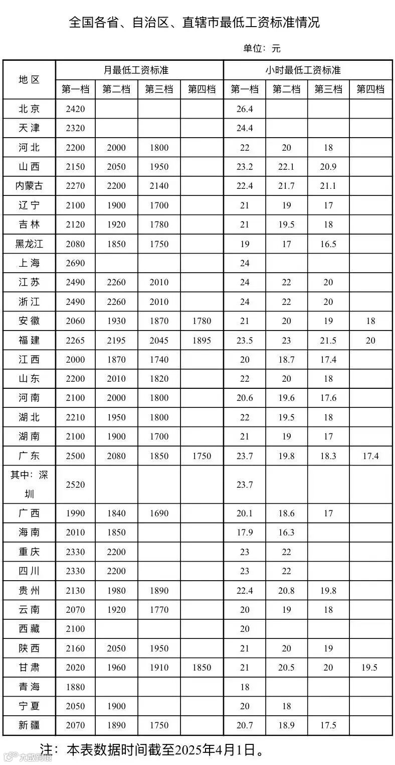 3月1日起,广东调整提高该省全日制就业劳动者月最低工资标准和非全日制小时最低工资标准。此次调整仍保持四类标准,其中广州、深圳执行一类标准,广州市调整为2500元/月,深圳市调整为2520元/月,两市对应的非全日制小时最低工资标准均为23.7元/小时。