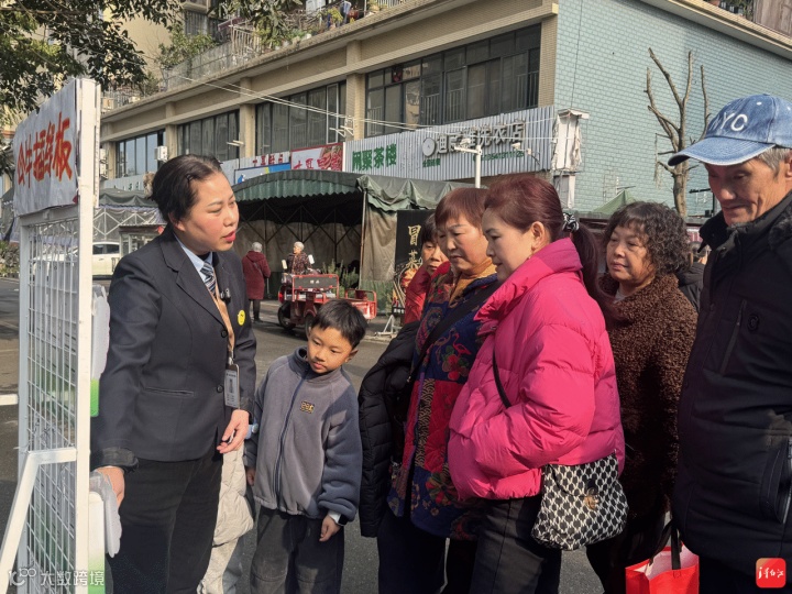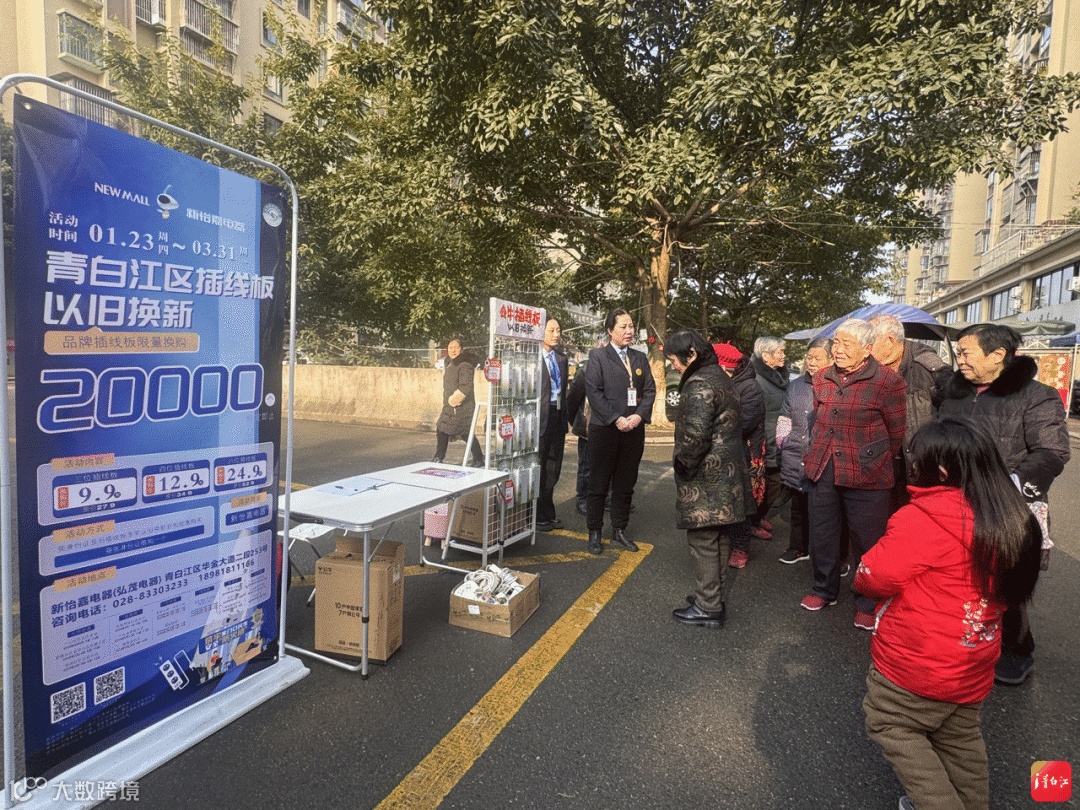 在弥牟镇国光社区蜀韵南庭小区,青白江区插线板“以旧换新”活动现场,新怡嘉电器工作人员正在耐心地给过往居民讲解政策。