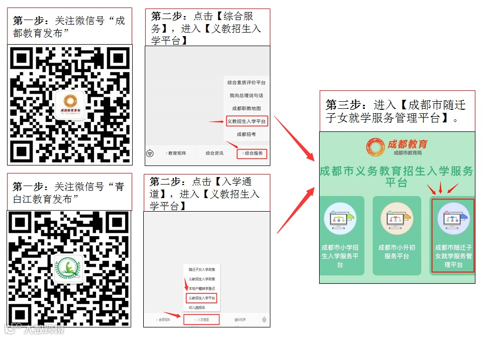 关注微信公众号“成都教育发布”,点击底部菜单栏“综合服务”(或关注微信公众号“青白江教育发布”,点击底部菜单栏“入学通道”),进入“义教招生入学平台”,再进入“成都市随迁子女就学服务管理平台”,注册、登录后,按要求填写相关信息,上传相关资料,提交入学申请。