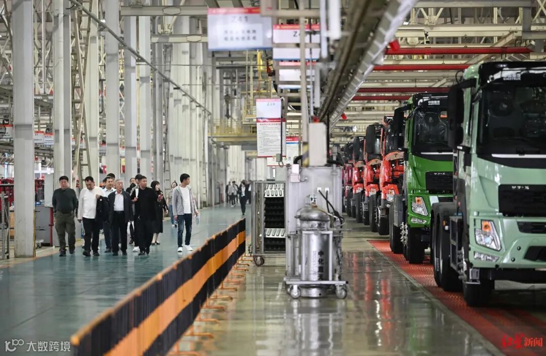 ▲参加展销会的企业代表参观重汽成商生产线 王效 摄