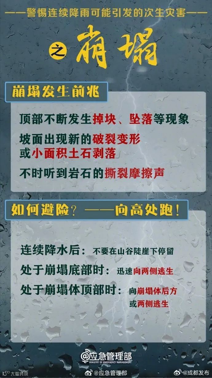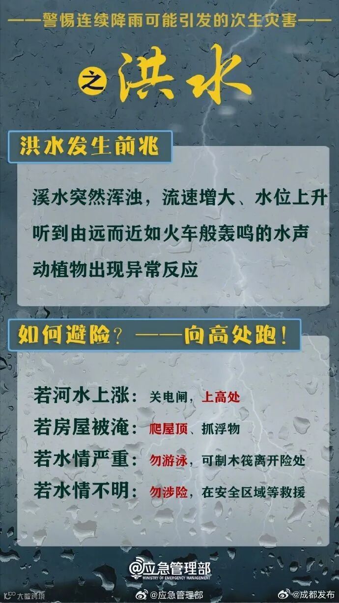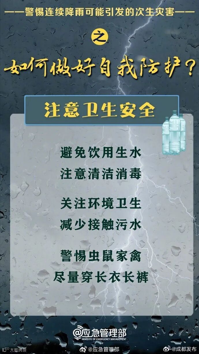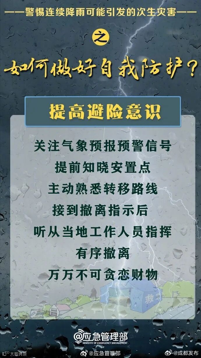 成都市水务局提醒,请广大市民朋友注意防范,尽量减少外出。防御指南: