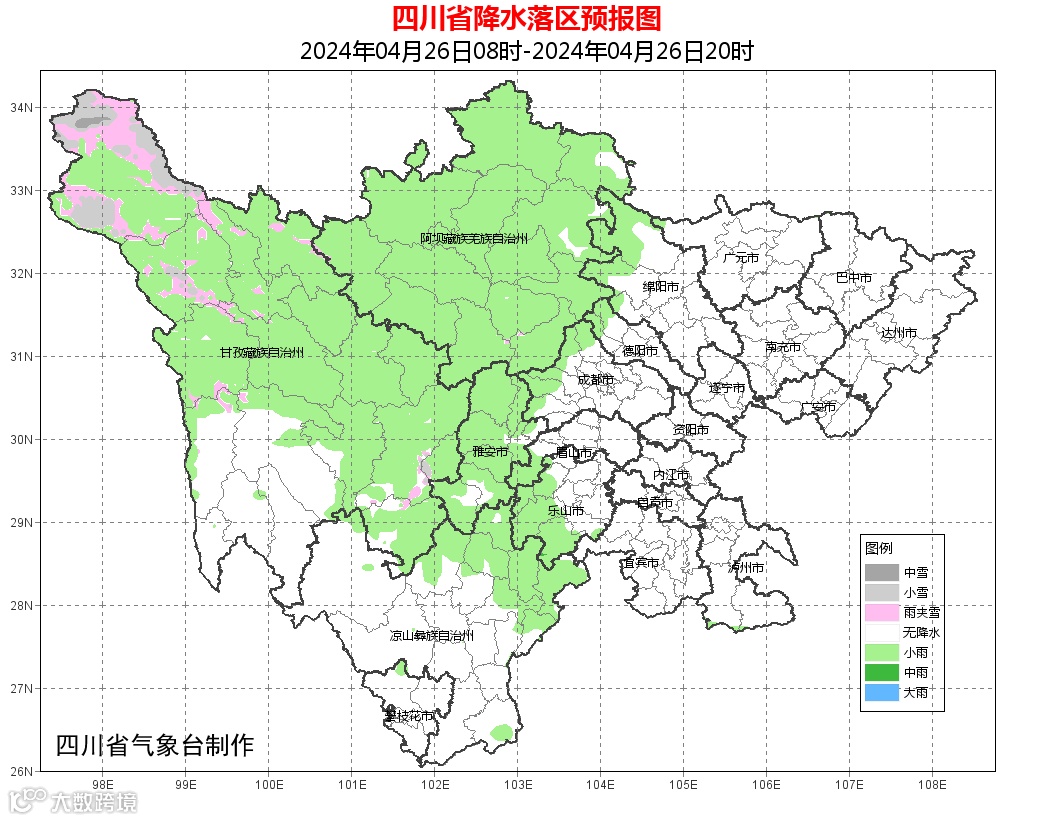明天白天:盆地大部多云间阴,其中西部沿山有分散阵雨;川西高原大部和凉山州东北部阴天间多云有分散阵雨(雨夹雪),攀西地区其余地方多云间晴。