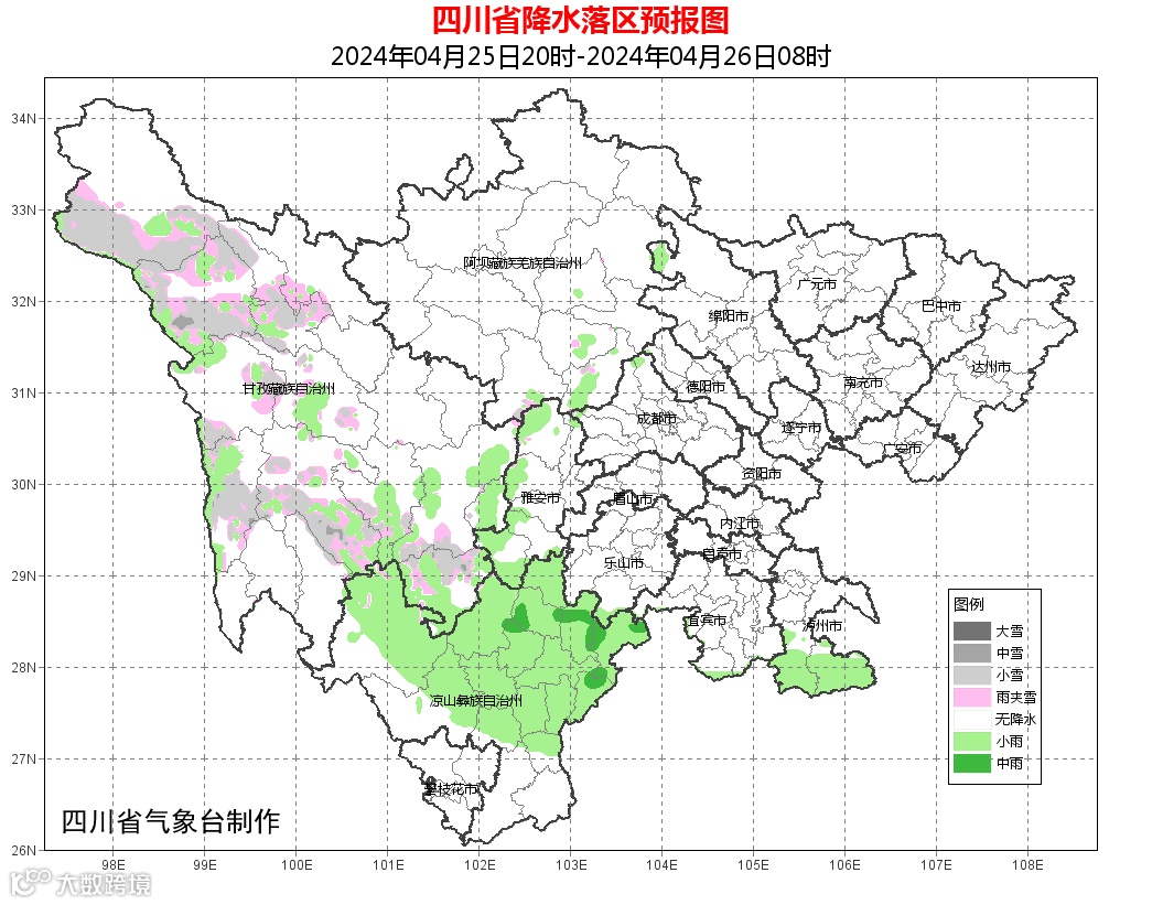 今天晚上:盆地大部多云;甘孜州和凉山州北部阴天间多云有分散阵雨(雨夹雪),其中凉山州东北部局部有中雨,阿坝州和攀西地区其余地方多云间晴。