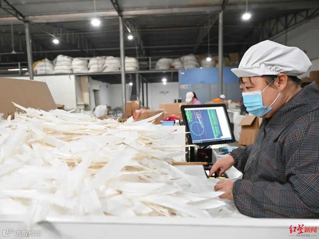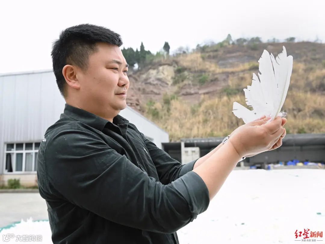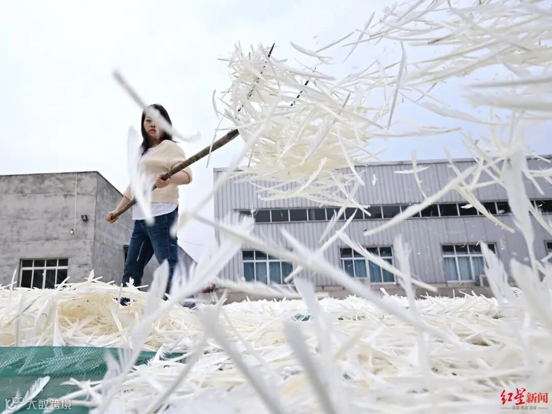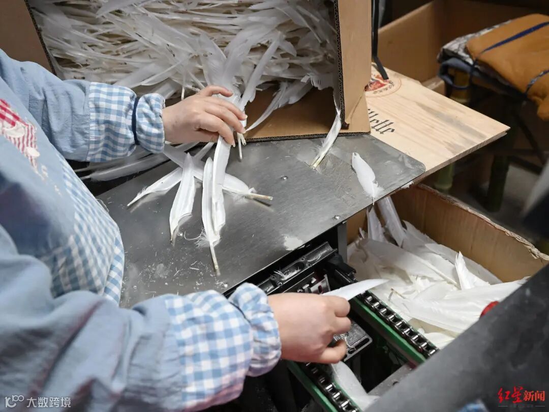 这样一套20多道工序的标准化流程下来,每一片大白鹅的羽毛在成羽公司内,就要待接近一个月的时间。