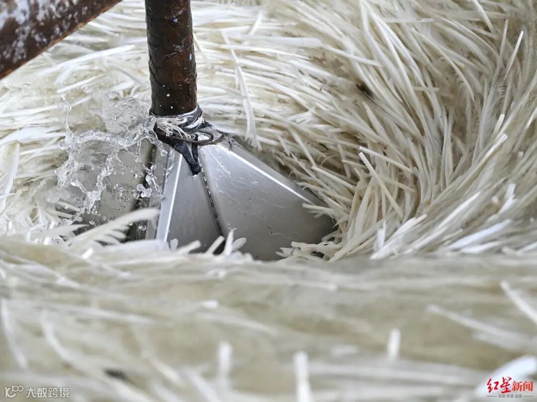 在精洗池中,25公斤多鹅毛经过漂洗之后,被依次倒入甩干机,随后由工人摊晒在水泥地上。