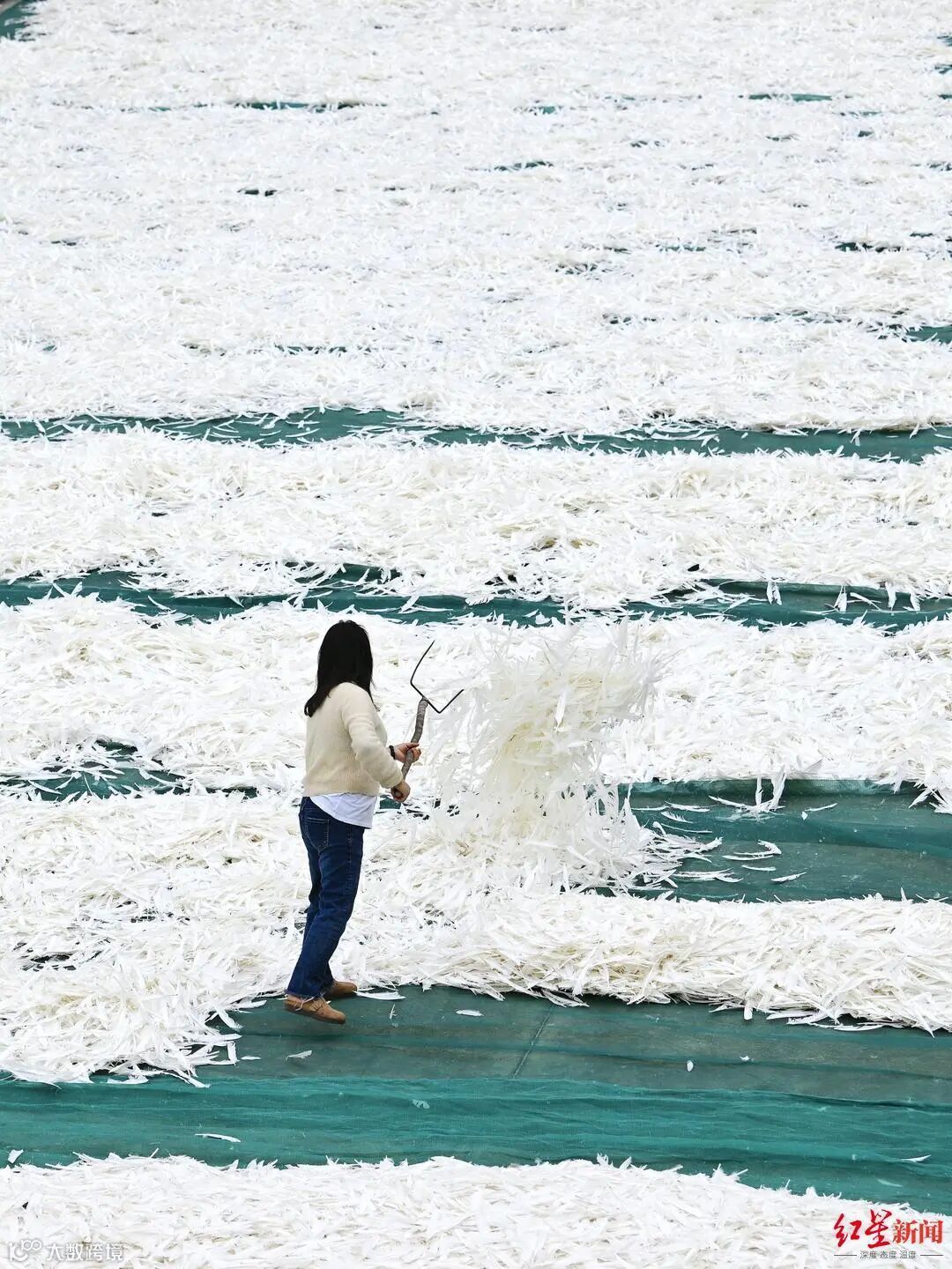 晴空之下,成羽体育用品有限公司(简称“成羽公司”)的大晒场铺满了雪白的鹅毛。这些经过多道工序之后的鹅毛,被铺平在了近千平方米的水泥地上。如果天气晴朗,这些鹅毛将在经历3-5天的晾晒之后,才能进入到后续的工序当中。