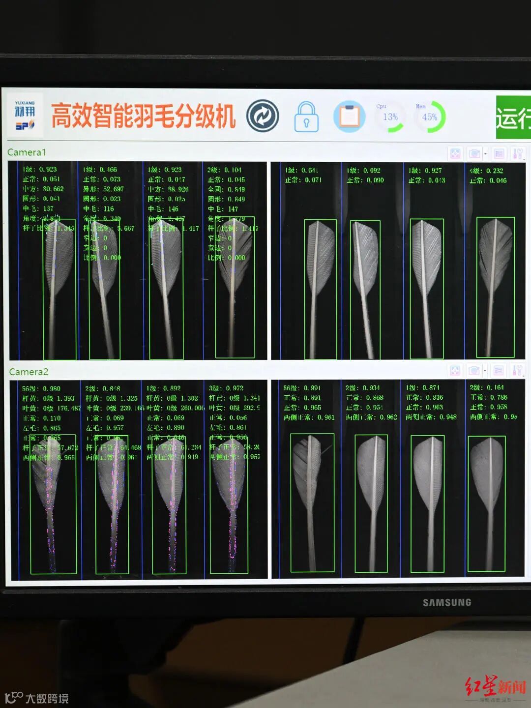 羽毛片通过智能羽毛分级机进行分级