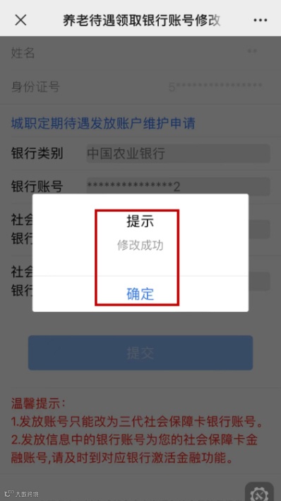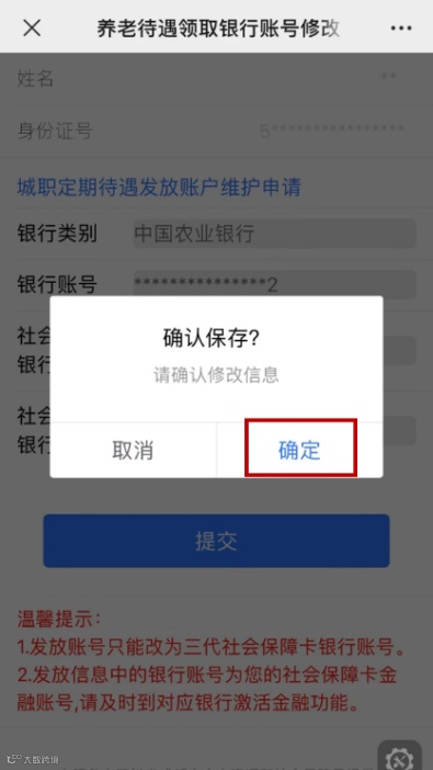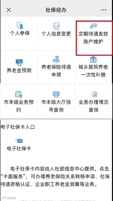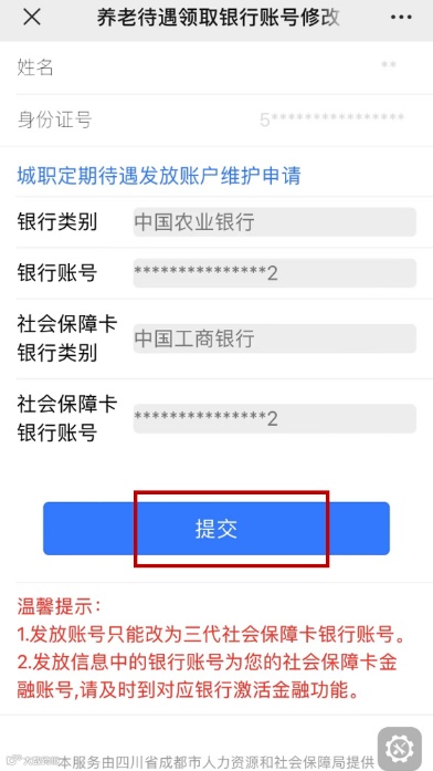 在“成都社保”微信公众号内,点击“社保服务—社保经办—定期待遇发放账户维护”,系统自动识别本人社会保障卡对应的银行账户,核对无误后,点击“提交”,变更为社会保障卡领取养老金。变更成功后,就可以使用社会保障卡领取养老金了。