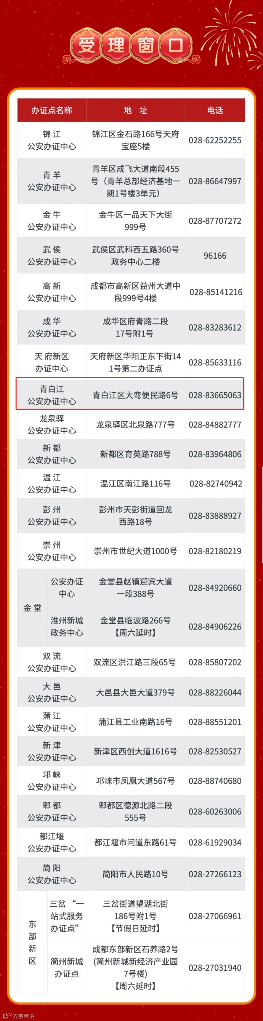 近期各出入境接待大厅人流量较大,广大申请人可通过“移民局12367”小程序(微信、支付)提前预约,节约大厅等候时间。如有业务咨询,可关注“成都出入境”微信公众号“中国公民”板块,通过“小智一点通”小程序,获取涵盖申请材料、申请方式、办理时限、收费标准、受理部门等重点内容的个性化“一对一”办证须知,或拨打“12367”移民管理政务服务热线。同时,欢迎广大市民拨打“028-86407063”成都出入境投诉电话进行监督。