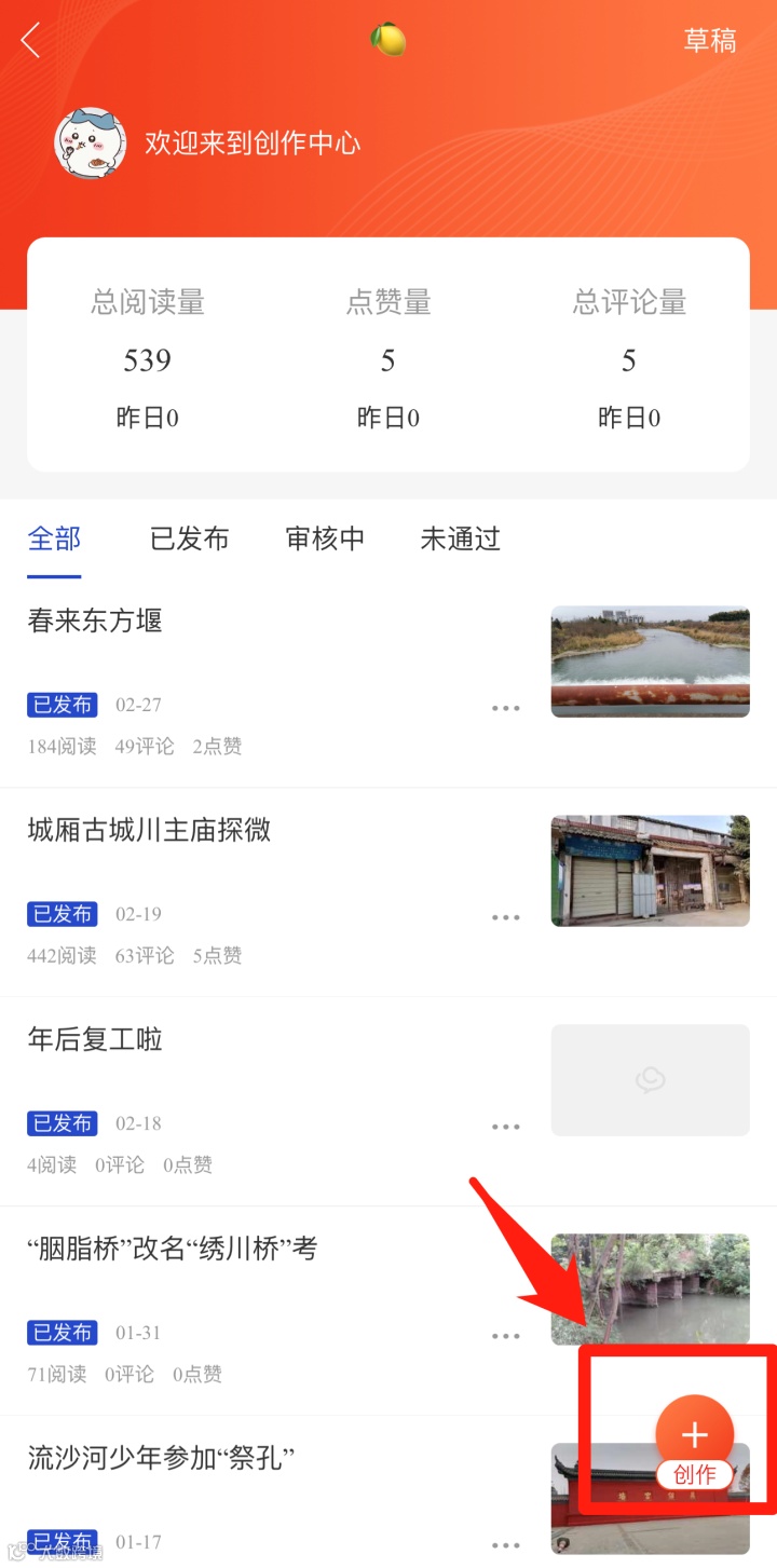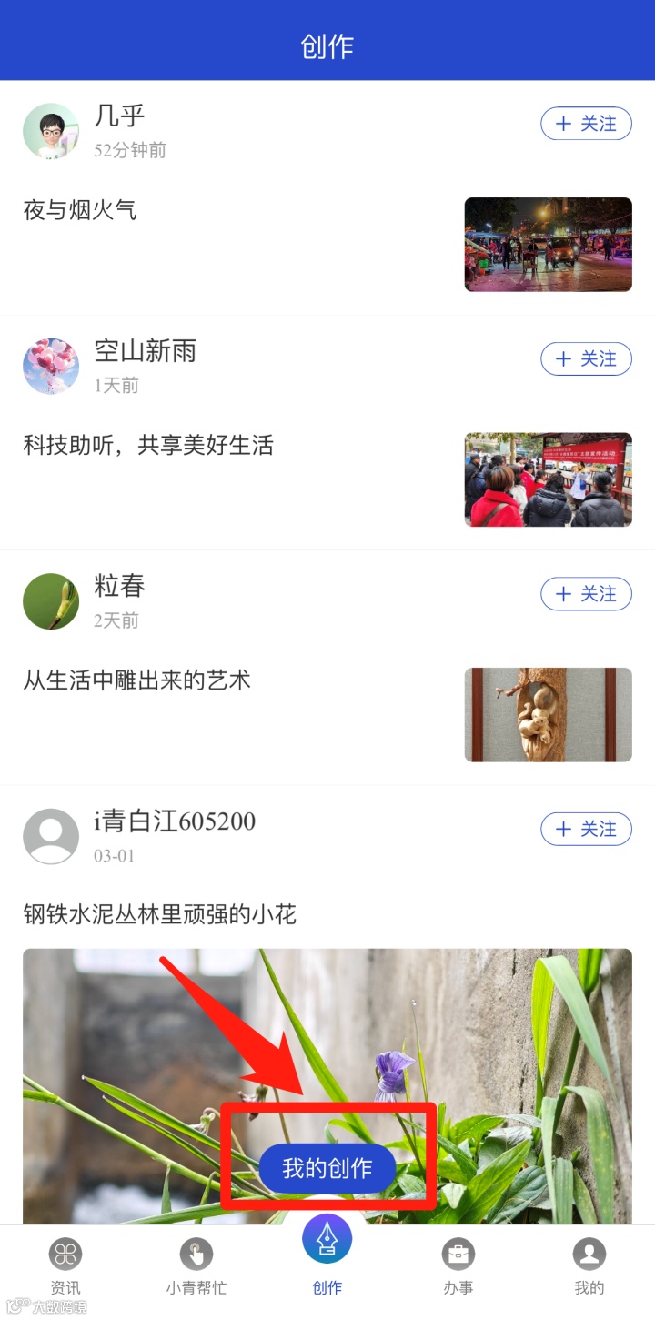2. 点击“创作”-“我的创作”进入个人创作中心,上传以春天为主题的摄影/视频作品,输入话题#盛开的青白江#。作品通过审核即视为投稿成功。(PS:未带话题的投稿视为不参与活动)
