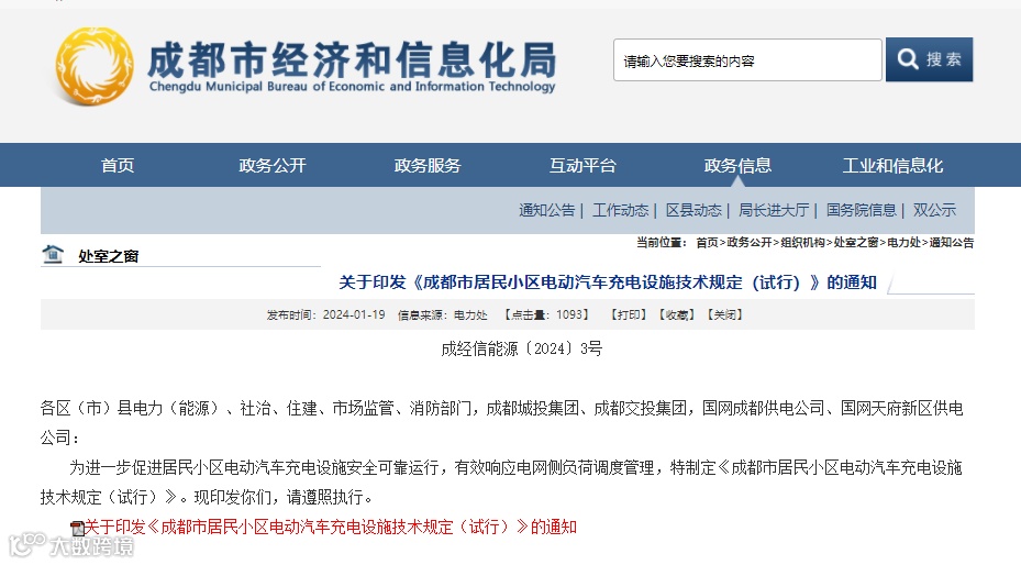 为进一步促进居民小区电动汽车充电设施安全可靠运行,有效响应电网侧负荷调度管理,日前,成都市经信局会同市委社治委、市住建局、市市场监管局、市消防救援支队联合发布了《成都市居民小区电动汽车充电设施技术规定(试行)》(简称《规定》)。