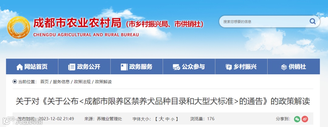 根据《成都市养犬管理条例》相关规定,市农业农村局会同市公安局向社会发布《关于公布<成都市限养区禁养犬品种目录和大型犬标准>的通告》(以下简称《通告》)。现将《通告》相关内容解读如下。