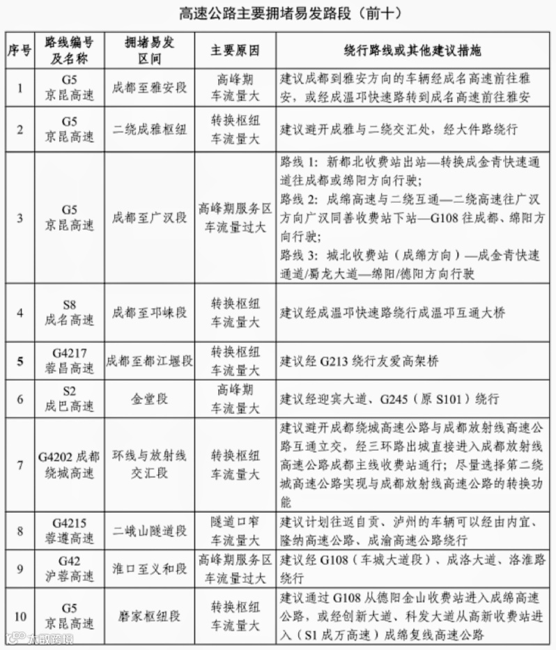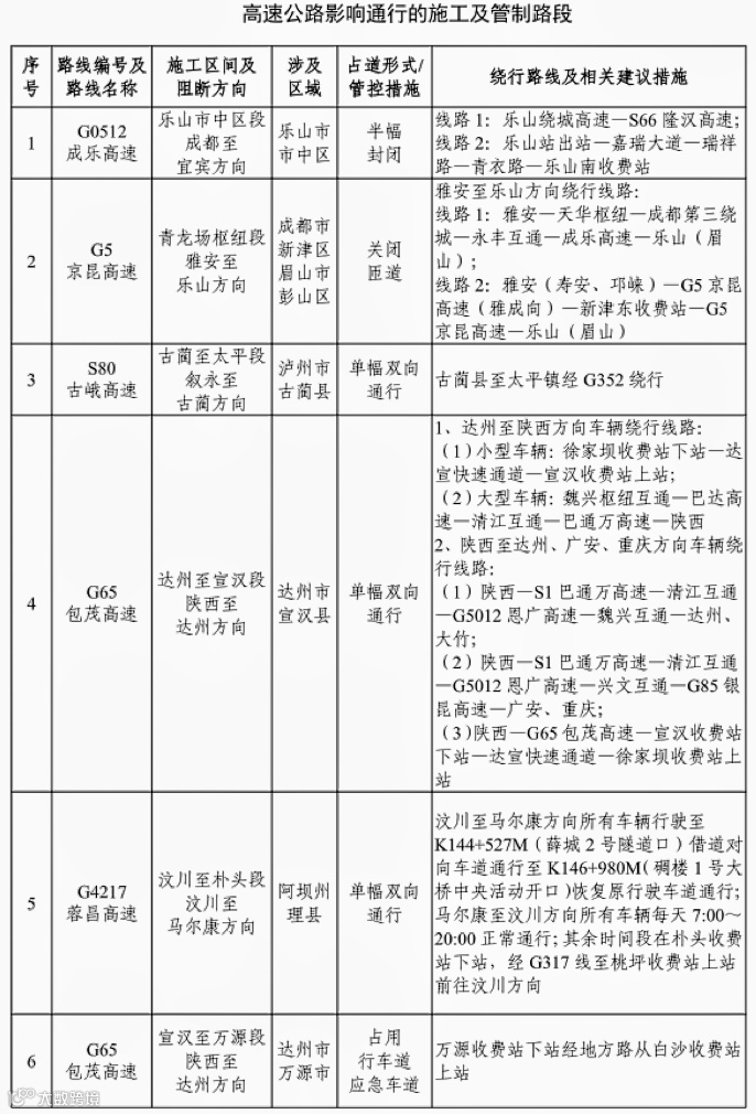 节日期间全省高速公路禁止危险化学品运输车辆通行,暂停对运输超限超载不可解体物品车辆允许通行高速公路的意见反馈,对除鲜活农产品运输车以外的三轴(含)以上货运车辆,四川公安交警将适时采取科学精准的临时交通管制、错峰通行措施。6月22日至24日,高速公路施工路段原则上停止施工,对辖区正在施工的路段要督促施工单位在节前尽快完工恢复路面,对因特殊情况不能完工的施工路段,严格规范标志标牌及安防设施。