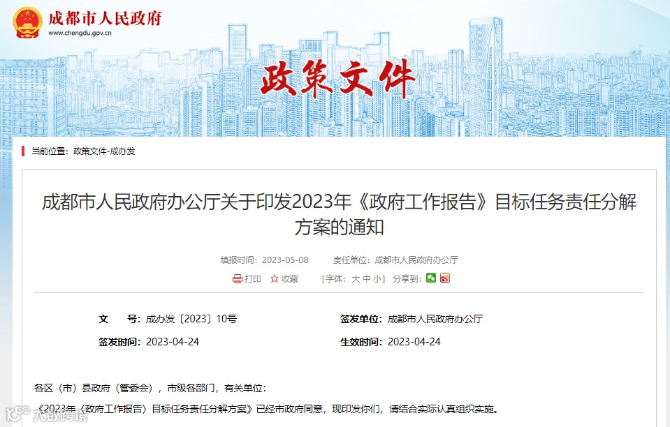 5月8日,成都市人民政府网站公布了《2023年〈政府工作报告〉目标任务责任分解方案》。