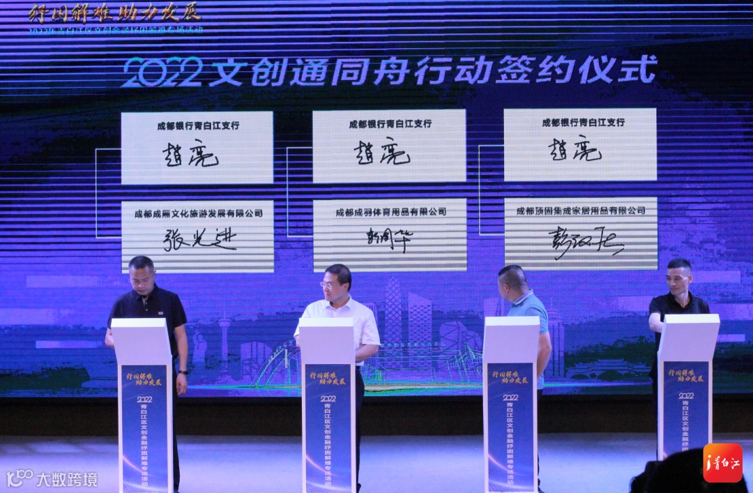 在银企对接环节,成都银行与成都成厢文化旅游发展有限公司、成都成羽体育用品有限公司、成都顶固集成家居用品有限公司3家企业进行2022年“文创通同舟行动”银企融资贷款现场签约,将给予3家企业2000万元低息贷款。随后,成都银行、成都农商银行、四川天府银行、建设银行、交通银行、中国邮政储蓄银行等银行金融机构分别就天府文产贷、小微易贷、蓉易贷等相关金融产品进行推介路演,为“稳增长稳市场主体保就业”提供充沛金融支撑。