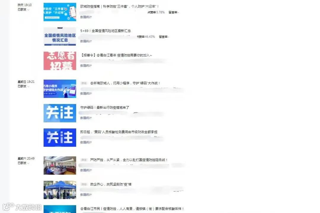 截止到目前为止,官方微信、微博、抖音平台共发布、转发疫情防控信息45条,已搭建“疫情防控跨区域来(返)人员备案登记表”小程序平台15个。