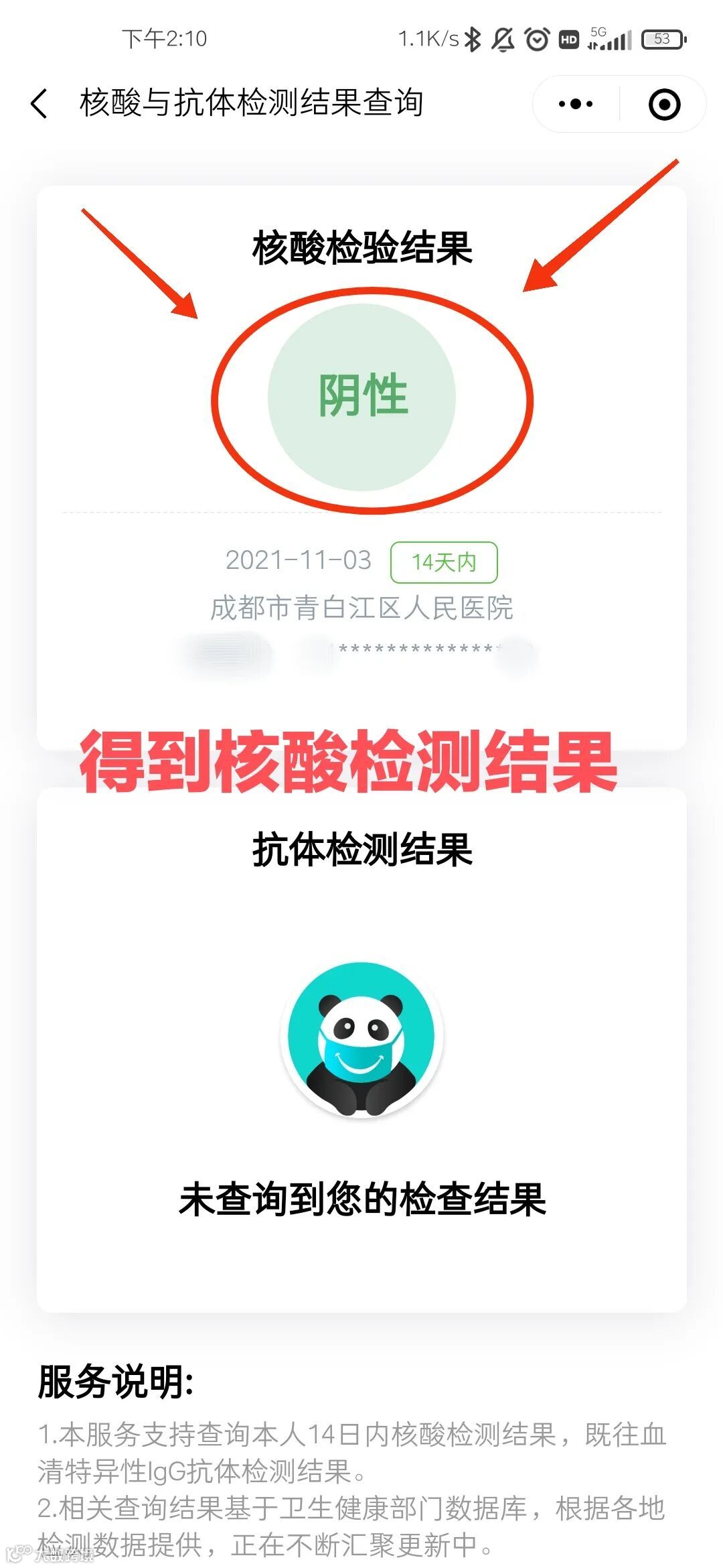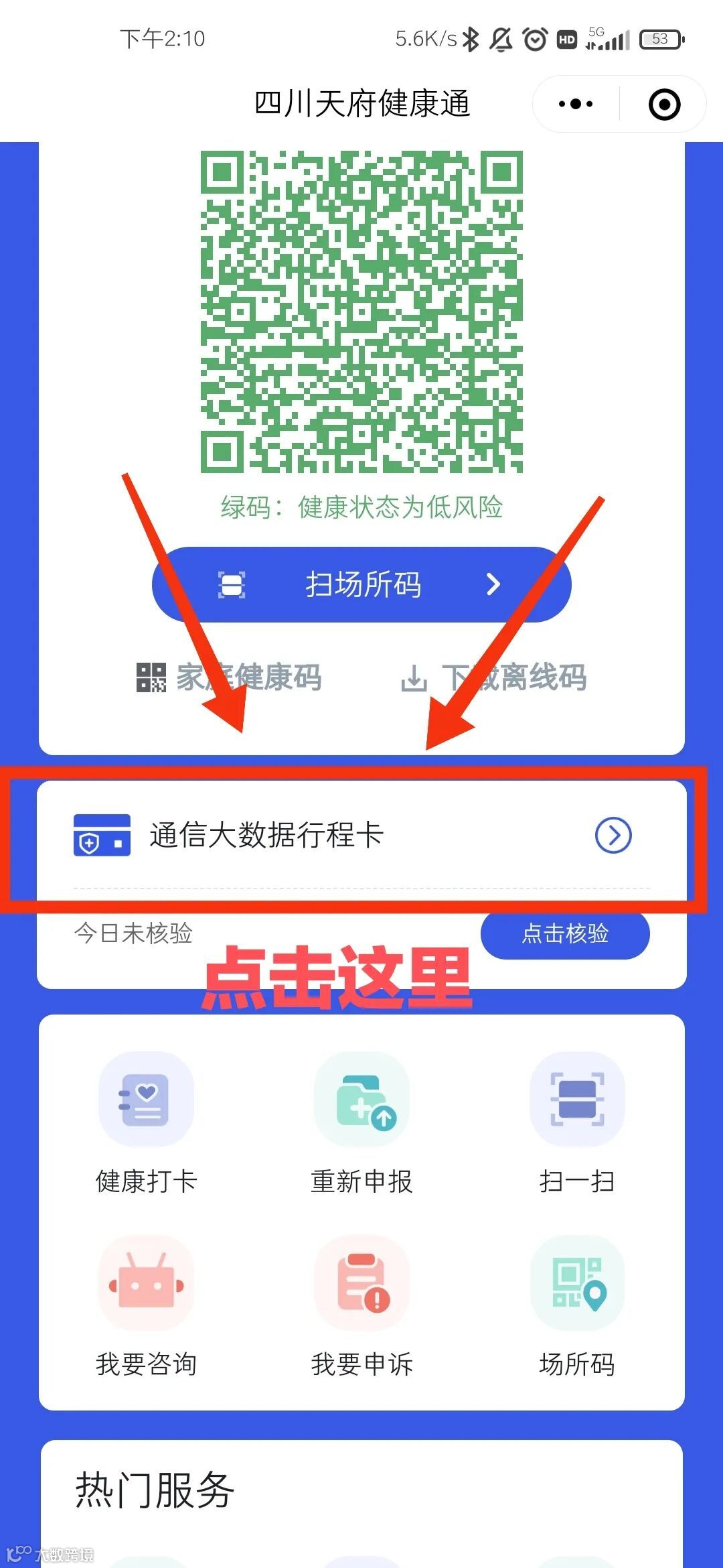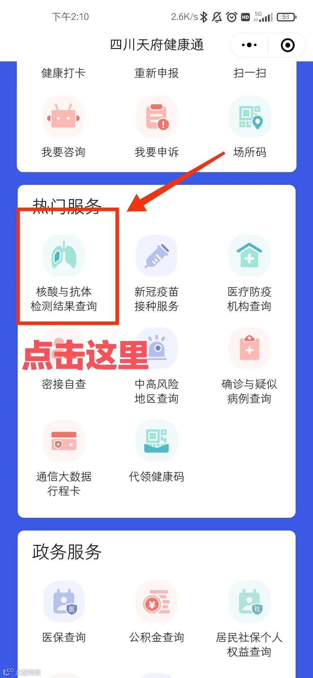 填写步骤2:在四川天府健康通内,点击健康码下面的“通信大数据行程卡”,进入行程卡界面截图。再点击热门服务里的“核酸与抗体检验结果查询”,进入核酸检验结果界面截图。