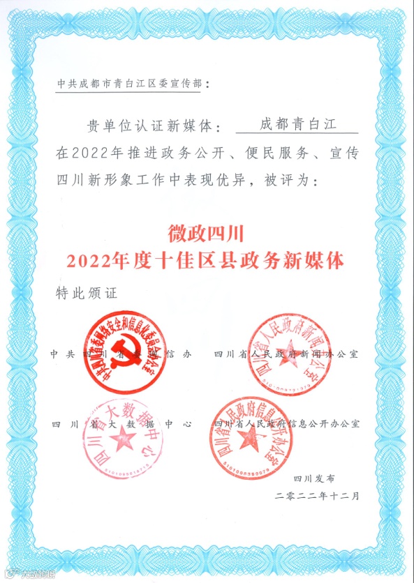 由中共四川省委网信办、四川省政府新闻办、四川省大数据中心、四川省政府信息公开办指导,四川新闻网传媒集团、四川发布主办的“微政四川——2022政务新媒体融合发展大会”在蓉举行。会上,青白江区官方政务新媒体账号“成都青白江”获评微政四川2022年度十佳区县政务新媒体,这是该账号连续第7年获评全省十佳。