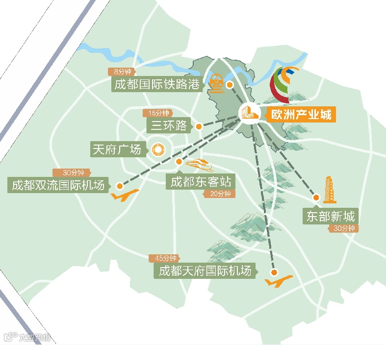 成巴、成南、成都二绕高速钻石围合,港城大道、清泉大道等快速路穿插其中,距离双流机场、天府机场40公里,2公里范围内设有TOD城市综合站点。