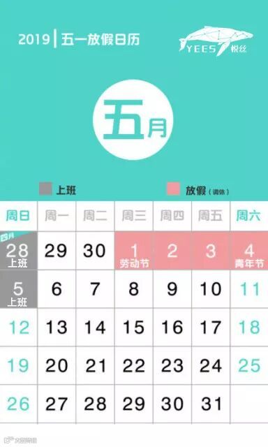 根据我国相关法律法规的放假要求及我司目前的实际情况,决定放假时间为:2019年5月1日至5月4日(星期三至星期六)放假调休,共四天。4月28日(星期日)及5月5日(星期日)正常上班。