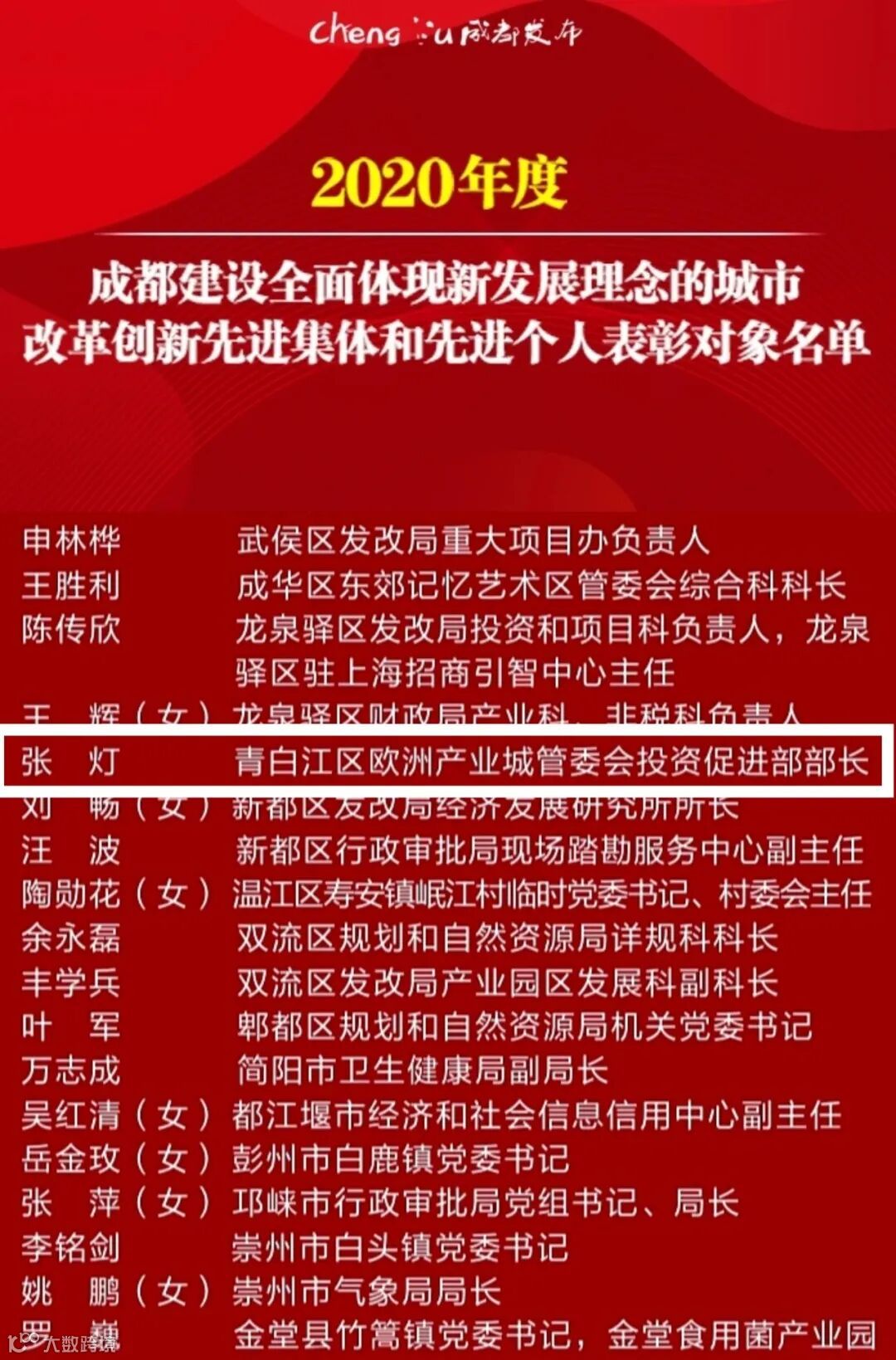 2020年12月,成都新年音乐会举行,隆重表彰劳动模范、先进集体和先进个人。欧管委投资促进部部长张灯荣获“2021年成都建设全面体现新发展理念的城市改革创新奖”。未来,欧城将坚定不移推动城市发展理念创新,主动融入“双循环” 齐心唱好“双城记”,比学赶超、开拓创新,争当新时代最美奋斗者!