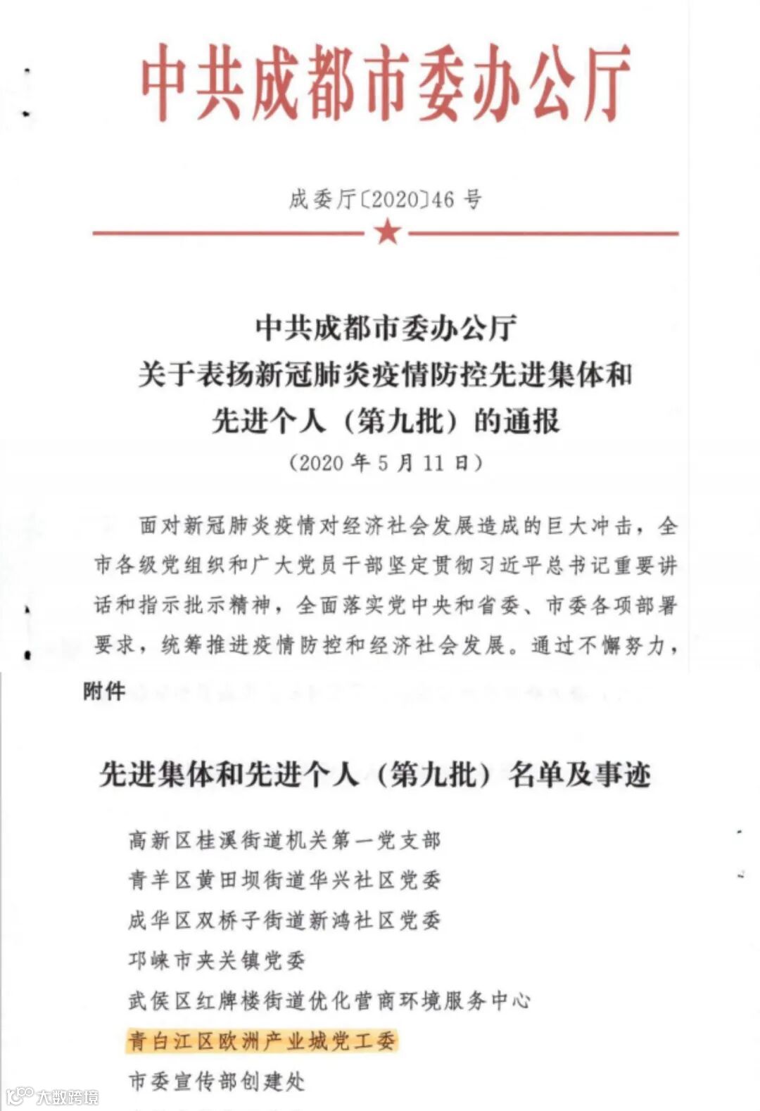 2020年5月,成都市委下达表扬新冠肺炎疫情防控先进集体和先进个人(第九批)通报,欧洲产业城党工委荣获“新冠肺炎疫情防控先进集体”。同年11月,欧管委企业服务部部长白子锐荣获“成都市抗击新冠肺炎疫情先进个人”称号。2020以来,欧洲产业城陆续收到各级防疫表彰,截止目前,已获得6次新冠疫情防控表彰,充分肯定了欧洲产业城疫情防控工作。