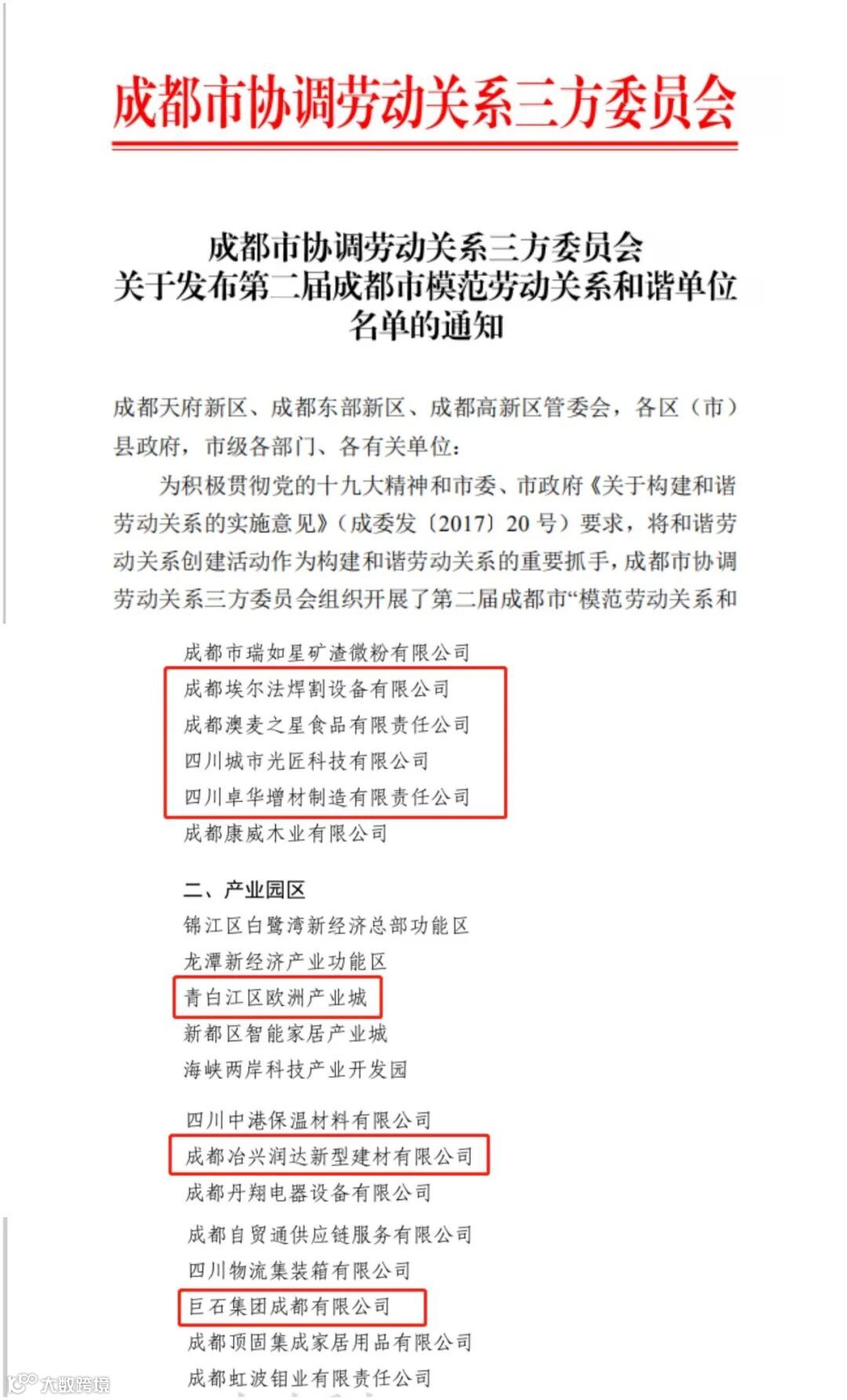 2020年12月,成都市协调劳动关系三方委员会发布第二届成都市模范劳动关系和谐单位名单。欧洲产业城首次上榜成都市2A级劳动关系和谐产业园区,同时,园区共计6家上榜,最高达到5A级。欧城一直致力于夯实协调劳动关系基层基础,健全完善构建和谐劳动关系的体制机制,全面提升构建和谐劳动关系!