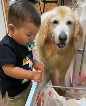 之前金毛姐姐给刚学会走路的人类弟弟当扶手,现在长大的人类弟弟拿零食给金毛姐姐吃...