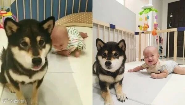 但让他没想到的是,等到娃7个月大,刚学会爬行时,根本不愿意搭理他,反而更喜欢追着黑柴爬...