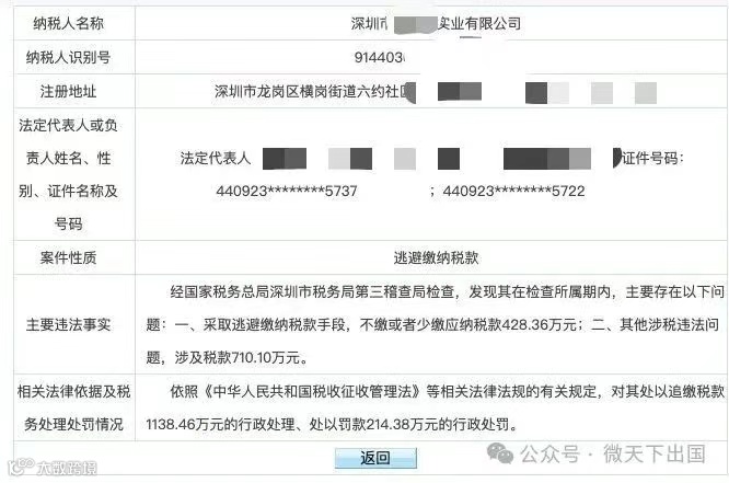 税务局披露,主要存在以下问题:一、采取逃避缴纳税款手段,不缴或者少缴应纳税款428.36万元;二、其他涉税违法问题,涉及税款710.10万元。最终,依照相关法律法规,对其处以追缴税款1138.46万元的行政处理、处以罚款214.38万元的行政处罚。