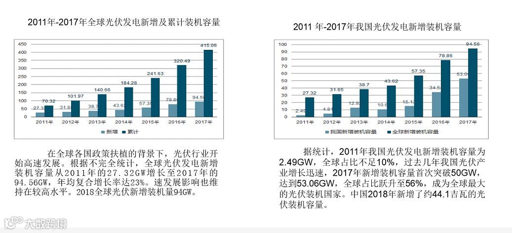 从2011年至2017年太阳能电池的发展现状出发,分析2011年-2017年全球光伏发电新增及累计装机容量、2011年-2017年我国光伏发电新增装机容量、2018年全球光伏发电新增装机规模、2011年-2017年硅片产量,总结太阳能电池的市场前景:“太阳能光伏行业仍面临较好的发展机遇,未来仍将保持较快的增长态势。”
