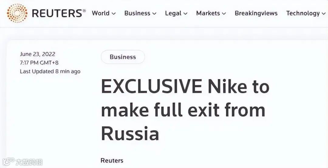 6月23日,美国运动服装制造商耐克向路透社表示,决定全面退出俄罗斯。