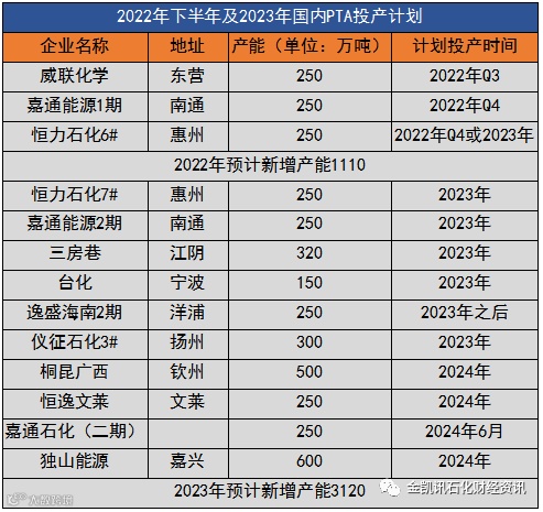 PTA投产的脚步也远没有停止。据统计,2022年下半年到2023年仍有大规模PTA装置上马,计划新增产能750万吨,2023年PTA产能预计增加3120万吨。