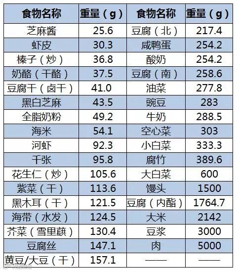 (数字越小的越补钙哦!比如:吃25.6克的芝麻酱可以摄入300mg的钙。)