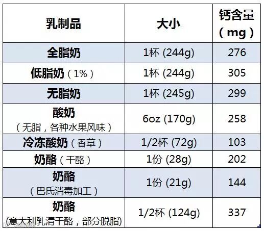 150毫升牛奶所含的钙 = 60毫升酸奶 = 30克全脂乳酪 = 27克奶粉 = 170克豆腐 = 150克熟西蓝花 = 60克鲑鱼罐头 = 50克沙丁鱼