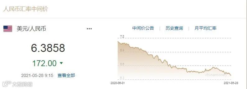 5月28日银行间外汇市场人民币汇率中间价为:1美元对人民币6.3858元,较上一交易日提升172个基点,迈入6.3元时代,创出近三年新高!