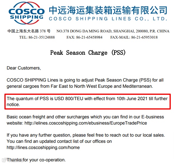 同一天,中远海运发布了亚洲-欧洲的旺季附加费(PSS)通知,涨幅达800美元/柜。