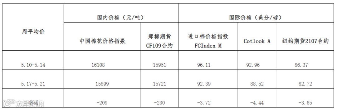 上周(5月17日-21日),国内外棉价受大宗商品市场波动影响,均有所回落。19日国务院常务会议提出“做好大宗商品保供稳价工作,保持经济平稳运行”,并指出要保障大宗商品供给,遏制其价格不合理上涨,国内各商品交易所提高了多个期货品种交易保证金比例,国内外棉价跟随下跌。上周中国棉花价格指数CC Index(3128B)周均价为15899元/吨,环比下跌209元;Cotlook A指数周均价为88.52美分/磅,环比下跌4.44美分,1%关税下折人民币14174元/吨,较中国棉花价格指数CC Index(3128B)低1725元,价差较前一周扩大492元;郑州商品交易所棉花主力合约CF109周均价15721元/吨,环比下跌230元;ICE棉花期货近期合约周均价为82.72美分/磅,环比下跌3.65美分。