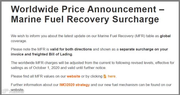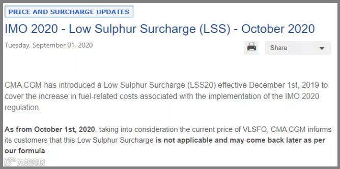 该航运公司表示:“从2020年10月1日起,考虑到当前极低硫燃料油(VLSFO)的价格,此附加费将不再适用。”