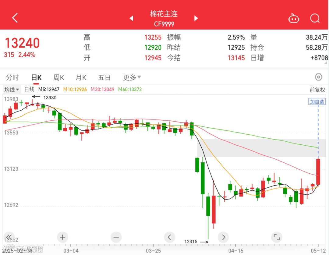 受此消息提振,棉花市场看涨心态增强,郑棉价格大幅上涨。5月12日,郑棉主力合约收于13240元/吨,涨315元,涨幅为2.44%。