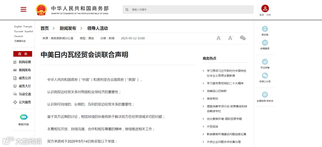 采取上述举措后,双方将建立机制,继续就经贸关系进行协商。中方代表是国务院副总理何立峰,美方代表是财政部长斯科特·贝森特和美国贸易代表贾米森·格里尔。协商可在中国、美国,或双方商定的第三国进行。根据需要,双方可就相关经贸议题开展工作层面磋商。