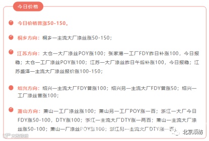 另外下游织造厂家对涤丝的刚需还是存在的,同时经历了前期低迷的产销,织造企业也有补货的需求。同时随着涤纶长丝价格的上涨,部分坯布辅料厂家也正在调整报价。