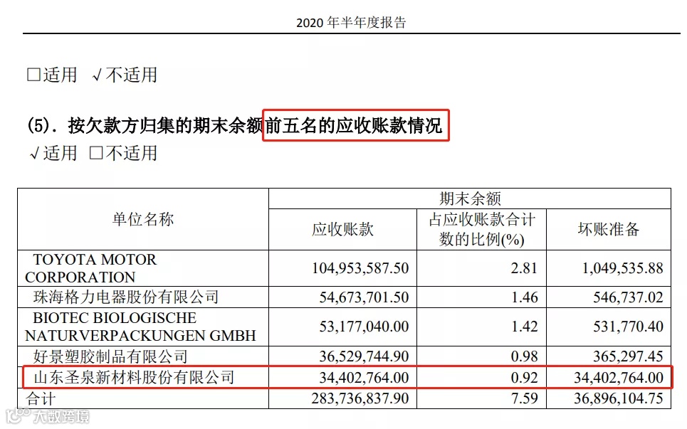 金发科技近日发布的半年报显示,金发科技对圣泉新材料的应收账款金额高达3440万元,并且按100%坏账计提,位列坏账准备的第一名,金发预计该笔款项无法收回。