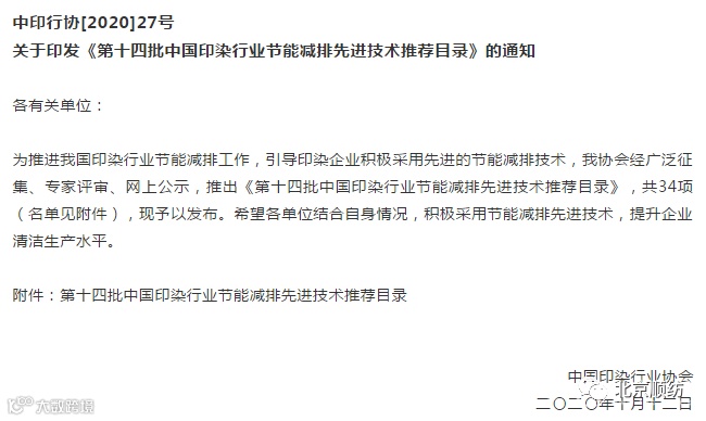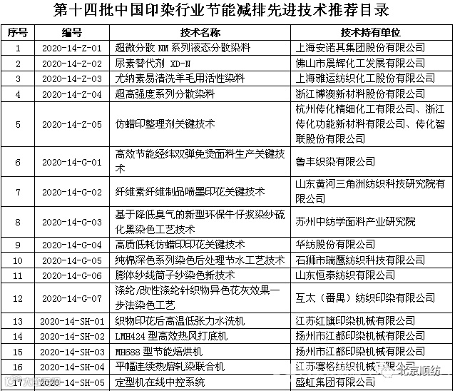 昨日,中国印染行业协会在“柯桥·2020全国印染行业节能环保年会”发布了《第十四批中国印染行业节能减排先进技术推荐目录》,共34项。具体如下: