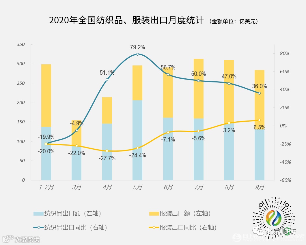 下半年以来,服装出口形势持续好转,9月份服装出口额为152.3亿美元,同比增长6.5%(以人民币计同比增长5.3%),连续两个月保持正增长态势。当前,我国纺织业较为稳定的产业链供应链也正在吸引部分海外订单回流。