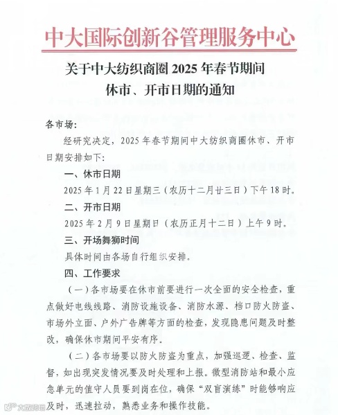 12月18日,中大纺织商圈2025年春节期间休市、开市日期的通知发布。根据通知,其休市日期为2025年1月22日星期三(农历十二月廿三日)下午18时;开市日期为2025年2月9日星期日(农历正月十二日)上午9时。