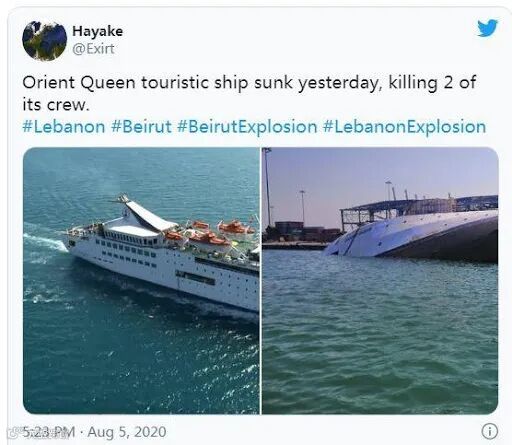 当地时间8月4日晚6时,黎巴嫩首都贝鲁特市中心附近港口区仓库区发生巨大爆炸事件,造成至少135人死亡,5000人受伤,另有数十人失踪。事件起因是易燃易爆品引燃了2700多吨硝酸铵。爆炸接连发生两次,导致多栋房屋受损,玻璃被震碎,天上升起红色蘑菇云。爆炸同时导致一邮轮沉没在贝鲁特港。