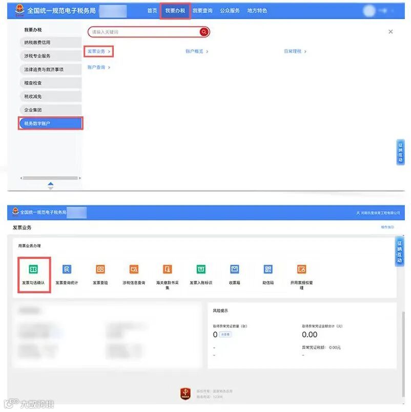 ✅ 方式2:【我要办税】→【税务数字账户】→【发票业务】→【发票勾选确认】,完成发票勾选。