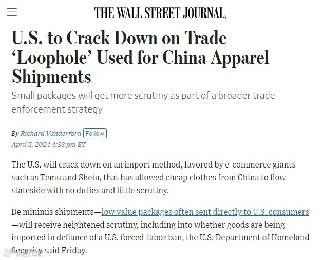 据美国《华尔街日报》网站4月6日报道,美国将打击Temu和希音(Shein)等电商巨头青睐的一种进口方式。报道称,这种方式允许来自中国的廉价服装免关税、几乎不经审查地流入美国。报道称,作为更广泛的贸易执法战略的一部分,小包裹将受到更严格的审查。