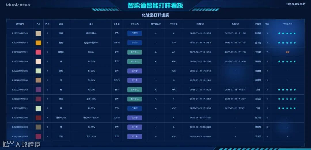 除此之外,在美欣达化验室还将设有两个电子屏幕,一个是打样进度屏,从业务接单、打样状态、客户确认、颜色评价等每一个环节都清晰显示在电子屏上;一个是打样统计屏,化验室的染色成功率,每个打样员的打样颜色、打样效率、以及时长占比等数据,打样实况一“幕”了然。